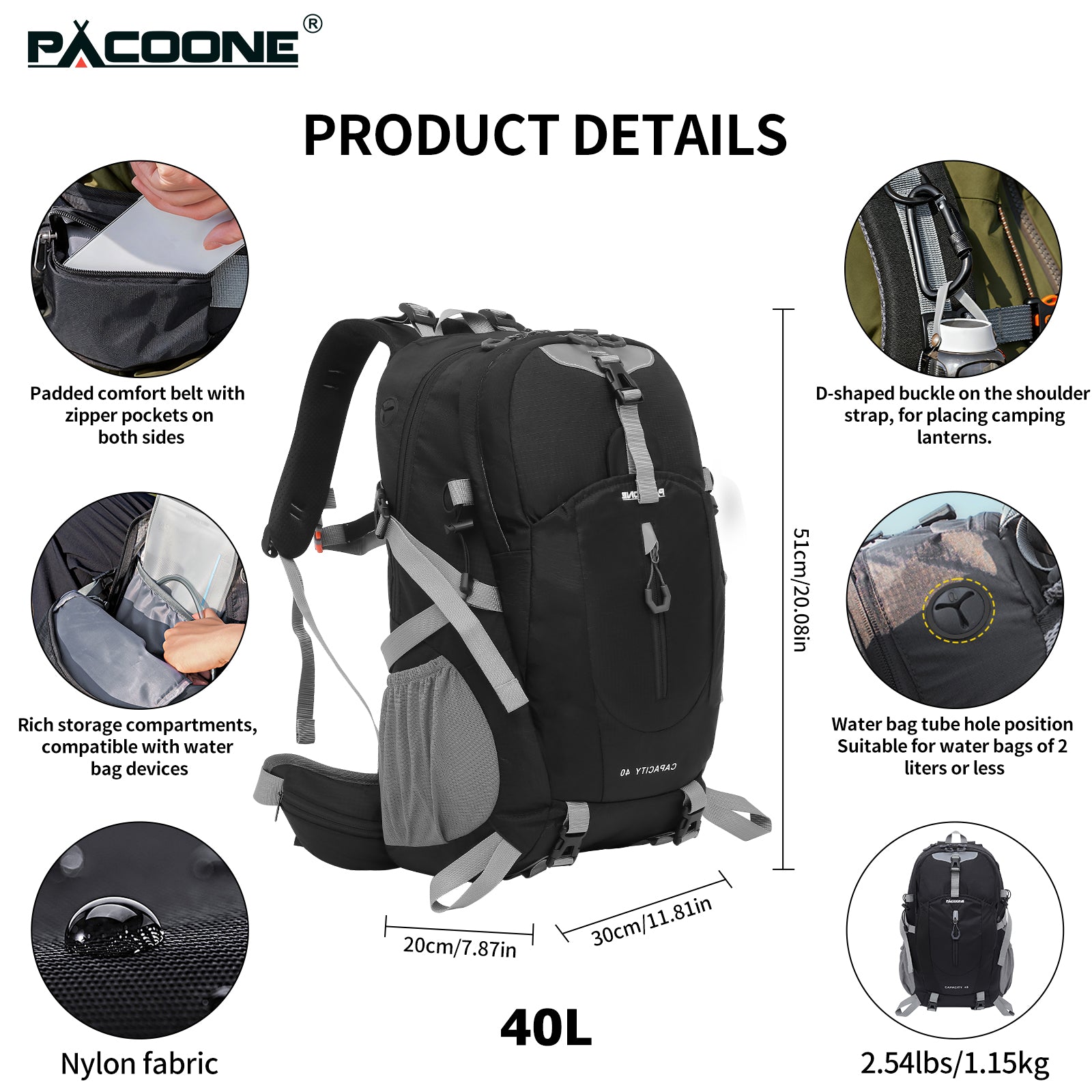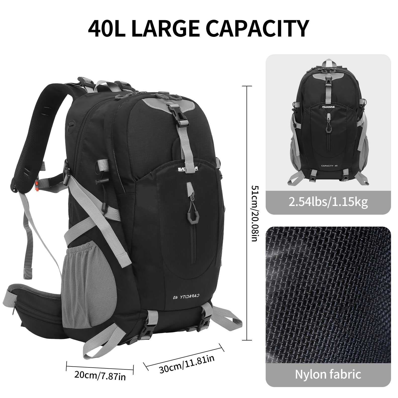 - Large Capacity & Multiple Compartment: Large capacity with a spacious main compartment and multiple pockets provides enough room for 3 or 4 day trips. Zipper closure, tight closure to prevent the items falling from the backpack. Two side pockets to carry additional water bottles. convenient and practical. Meets most airline size requirements.